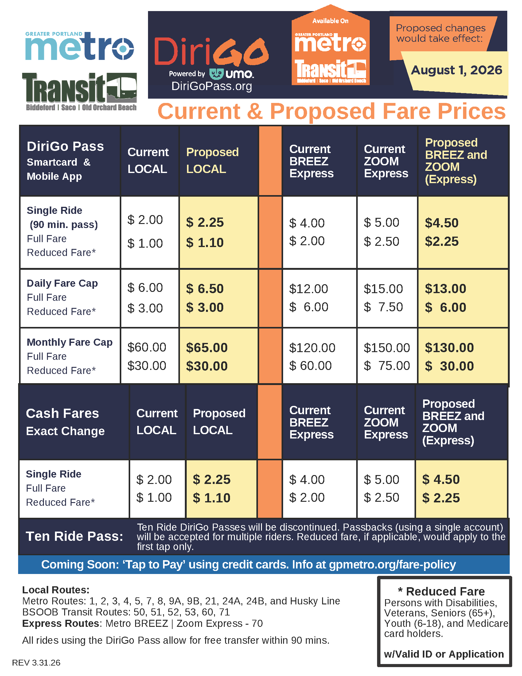 Greater Portland Metro is presenting these fare policy changes at meetings in April and May 2026.